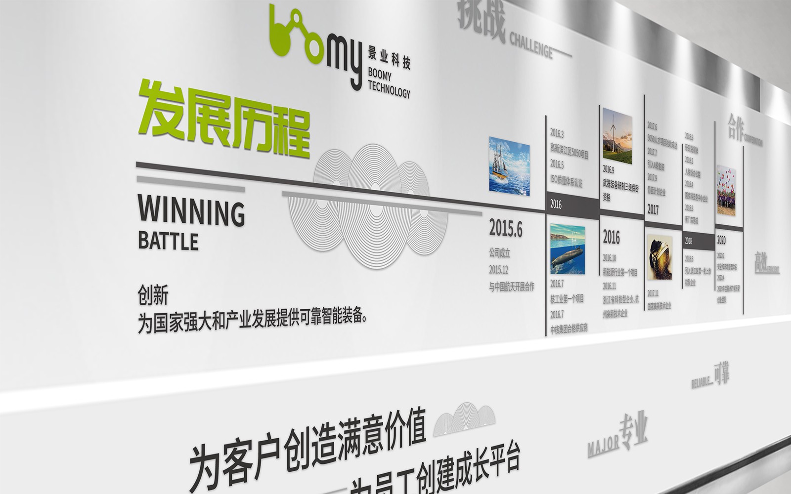 景業只能科技文化墻與榮譽墻的設計經過石特廣告的策劃,讓原本光禿禿的墻壁有了展示公司實力的窗口
