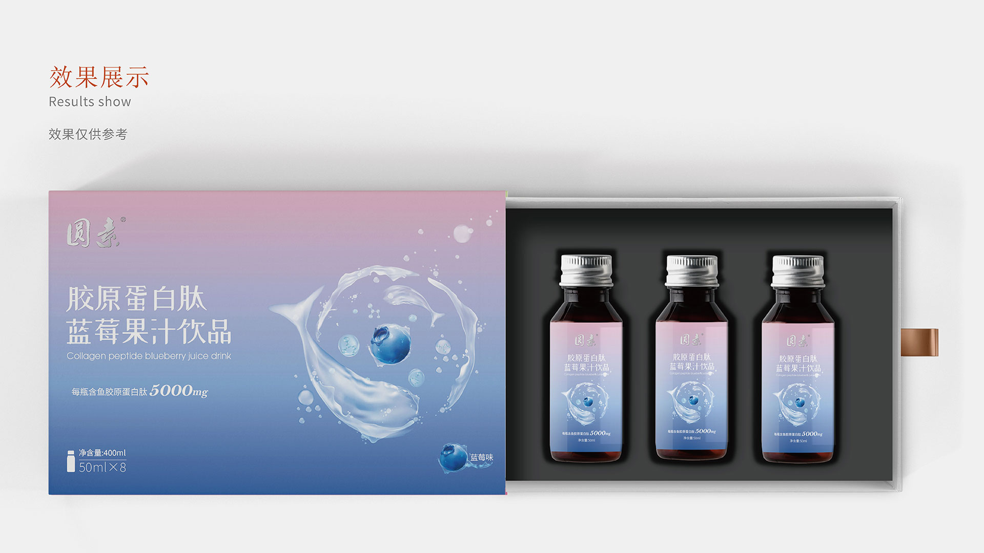 為能更好的突出藍(lán)莓濃縮果汁產(chǎn)品特性,根據(jù)品牌調(diào)性,石特在包裝上提出兩種方案:方案一:該款包裝以深海魚環(huán)繞藍(lán)莓游泳作為主畫面,其中深海魚以水狀的形態(tài)進(jìn)行呈現(xiàn),水滴融入分子式的元素,凸顯果汁飲品成分提取自深海魚的魚膠原蛋白;同時選取藍(lán)紫漸變色作為主色調(diào),年輕且時尚,包裝整體干凈簡潔。