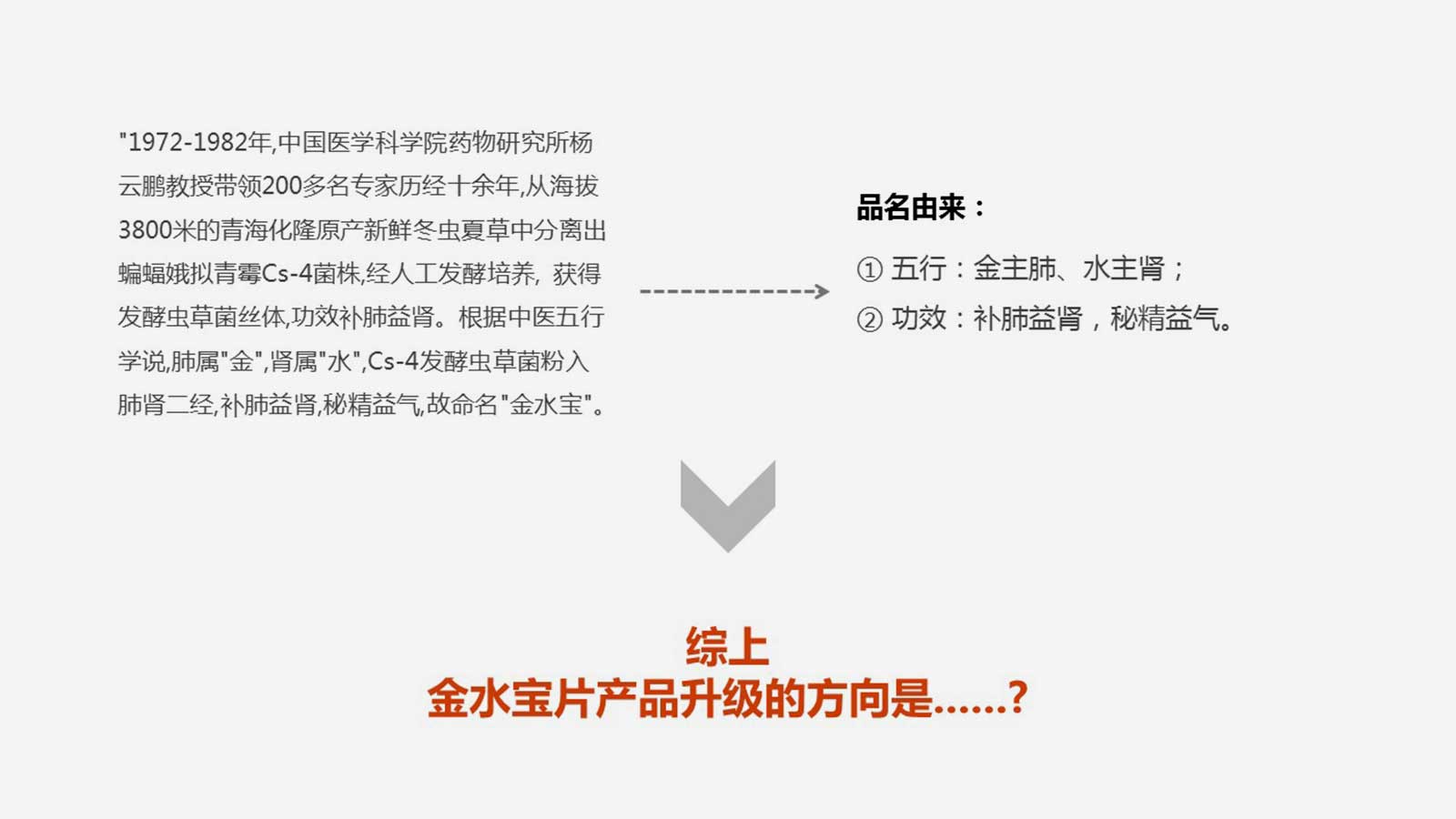 1972-1982年,中國(guó)醫(yī)學(xué)科學(xué)院藥物研究所楊云鵬教授帶領(lǐng)200多名專(zhuān)家歷經(jīng)十余年,從海拔3800米的青海化隆原產(chǎn)新鮮冬蟲(chóng)夏草中分離出蝙蝠娥擬青霉Cs-4菌株,經(jīng)人工發(fā)酵培養(yǎng), 獲得發(fā)酵蟲(chóng)草菌絲體,功效補(bǔ)肺益腎。根據(jù)中醫(yī)五行學(xué)說(shuō),肺屬"金",腎屬"水",Cs-4發(fā)酵蟲(chóng)草菌粉入肺腎二經(jīng),補(bǔ)肺益腎,秘精益氣,故命名"金水寶"。