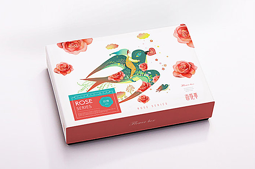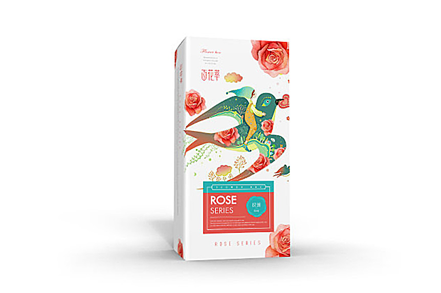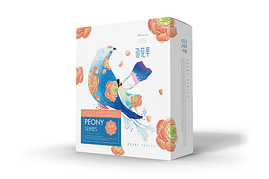百花萃護(hù)膚品在產(chǎn)品包裝上,logo字體變形給人一種文化韻味,Penoy和Rose系列包裝的畫面是分別以牡丹和玫瑰散落在小女孩和小鳥的四周,小女孩坐在鳥上,給人一種與自然融為一體的感覺。而牡丹和玫瑰的花瓣使Penoy和Rose系列產(chǎn)品得以區(qū)分,這一包裝設(shè)計(jì)使得百花翠系列產(chǎn)品神似而形不似在視覺上給人整體性。