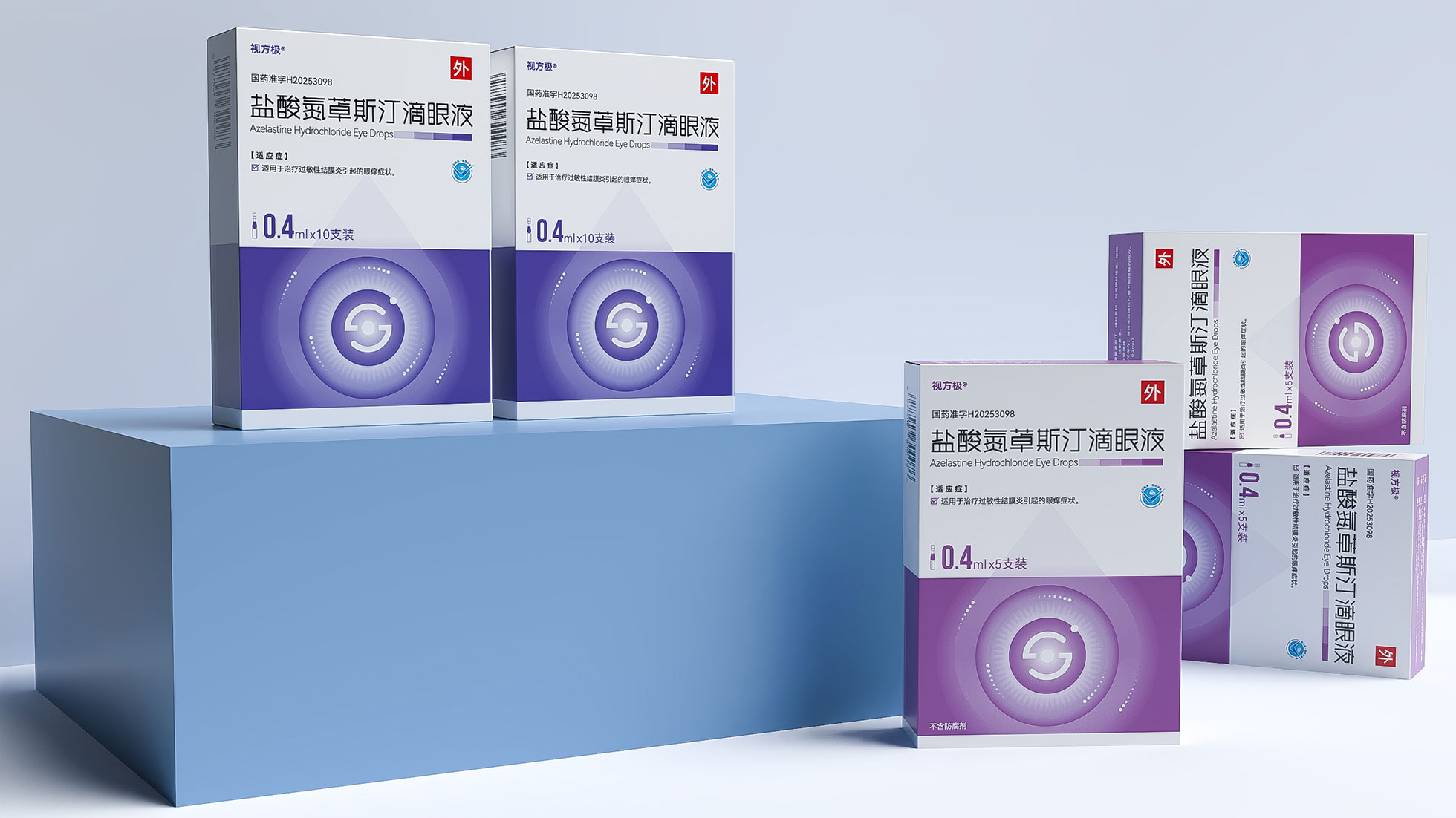 本項目是石特大健康為浙江視方極醫藥科技有限公司的核心產品——鹽酸氮?斯汀滴眼液,所提供的從終端包裝到專業DA(Detail Aid) 的一站式整合設計服務。該產品用于治療過敏性結膜炎,其市場成功既依賴于在藥店貨架上對消費者的直接吸引力,也離不開面向眼科醫生的專業學術推廣。我們的挑戰在于,如何構建一個統一的品牌視覺體系,使其在包裝上能清晰傳遞產品功效、激發購買欲望,同時在DA上能專業地呈現藥物機理和臨床優勢,成為醫生可信賴的處方依據,最終實現“藥店動銷”與“臨床推廣”的雙輪驅動。
